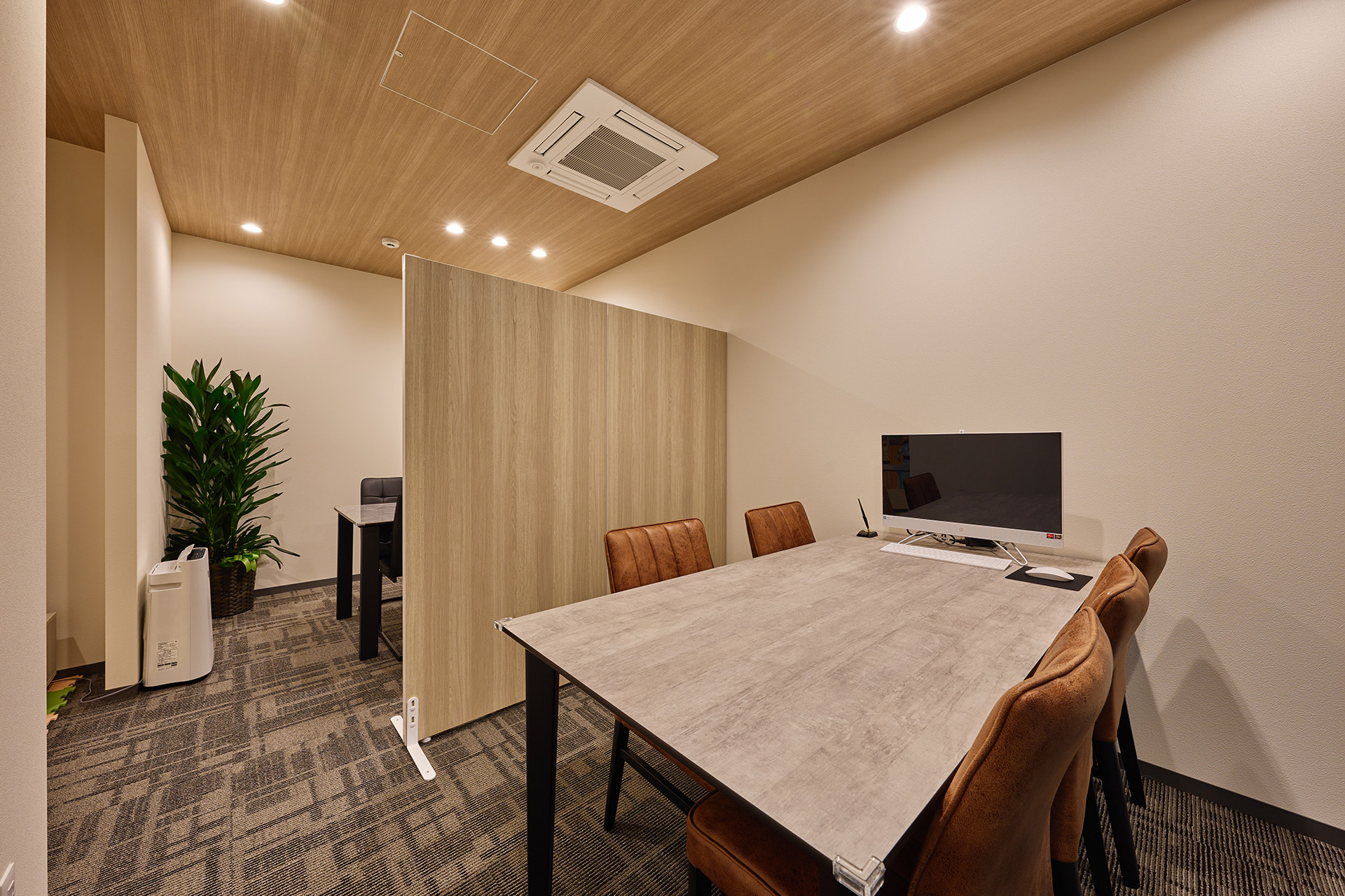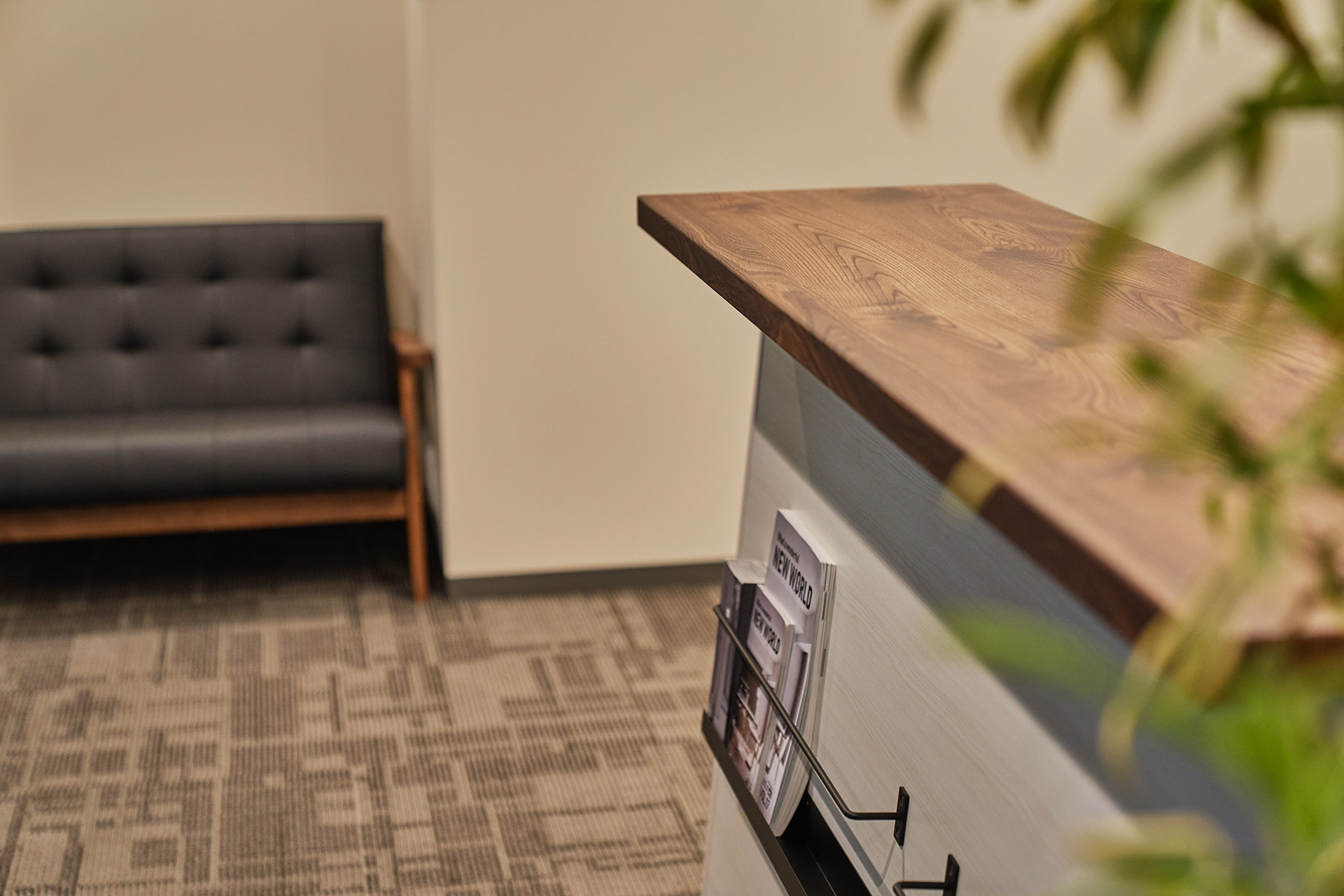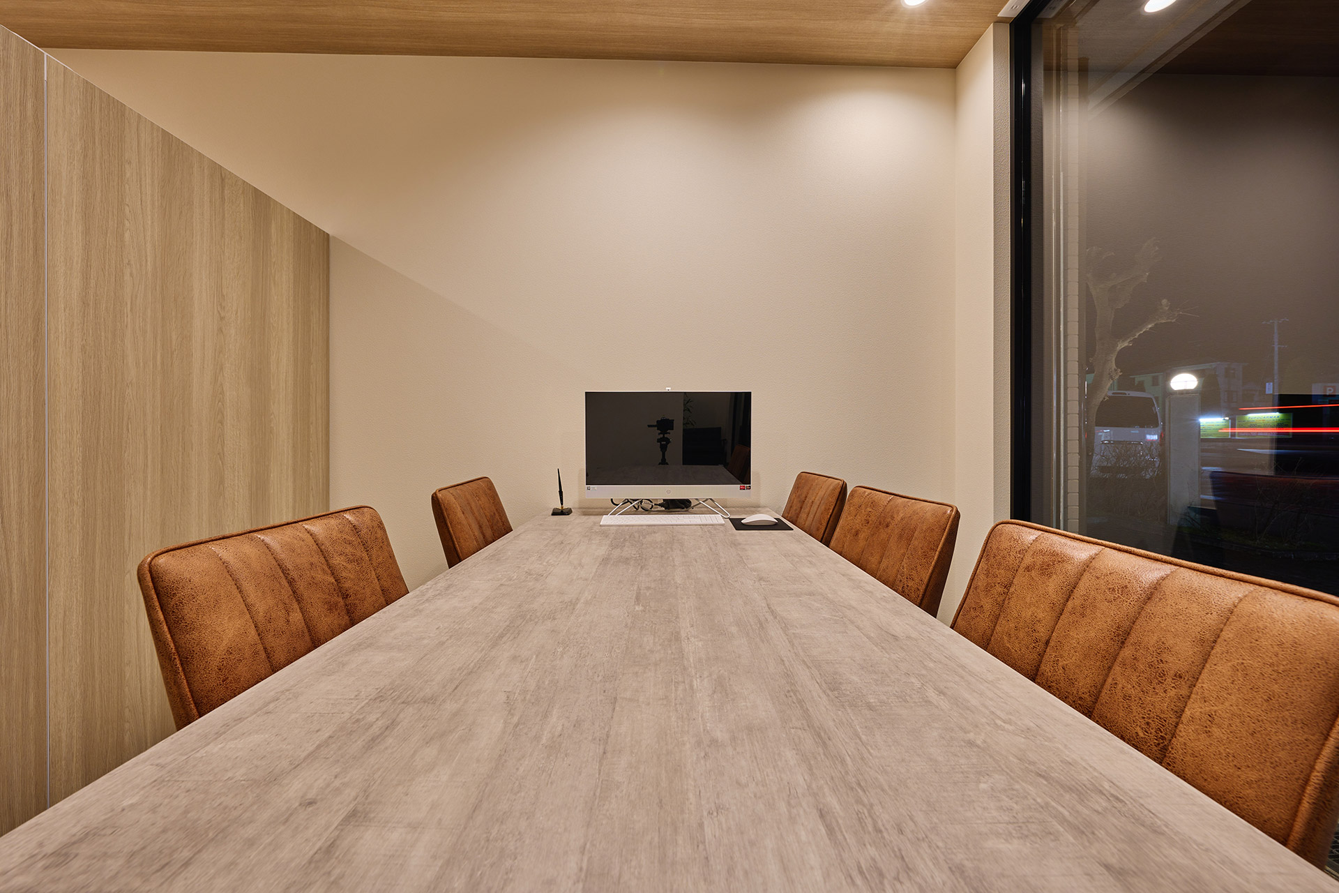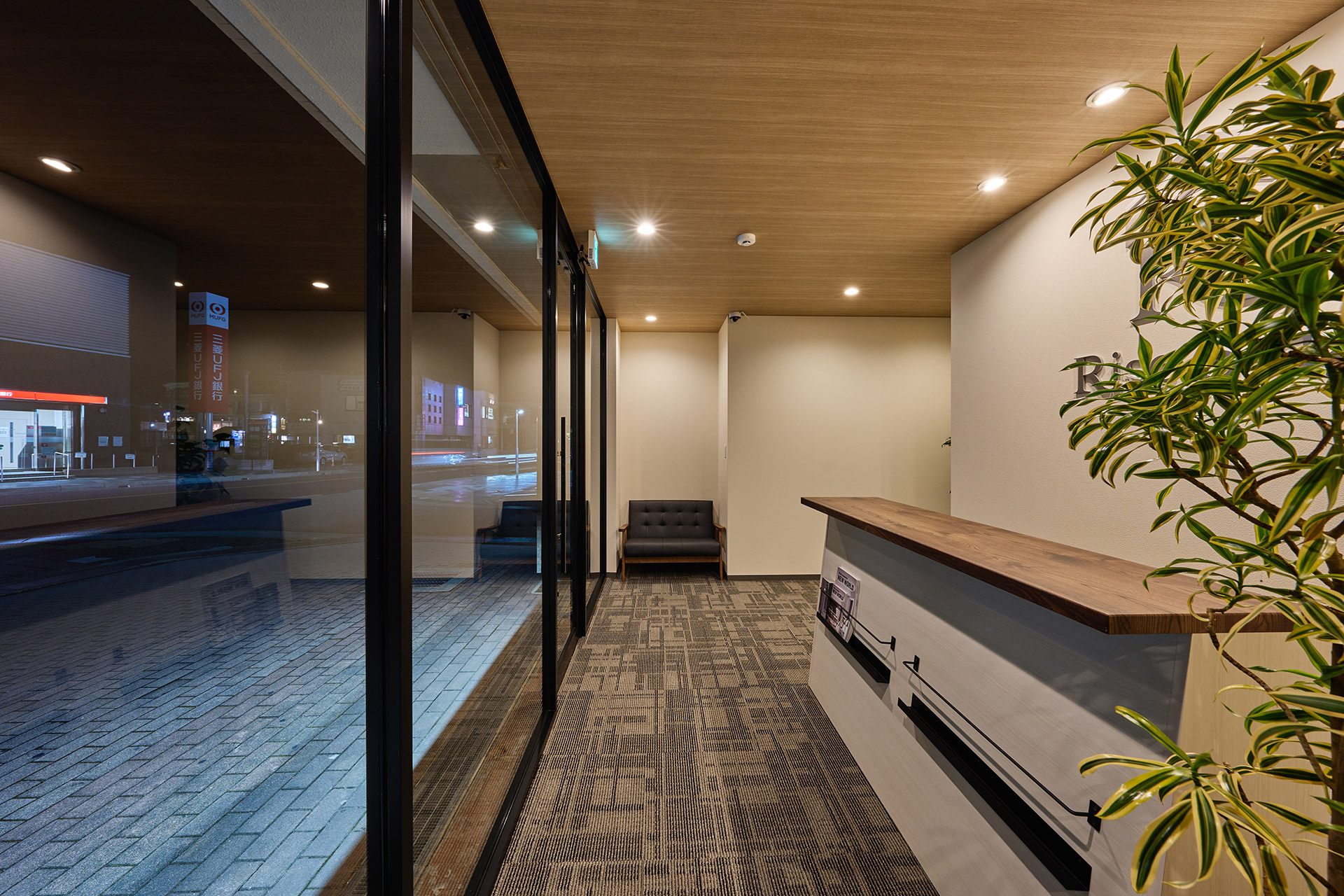エントランスは開放感あるガラス張りに。ご来店のお客様がゆっくりと落ち着いて商談できるように、天井にはナチュラルな木目調を。